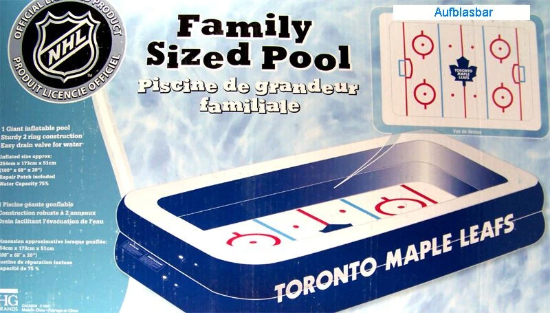 Aufblasbares NHL Toronto Maple Leafs Planschbecken für Groß und Klein. Auf dem Grund ist das Hockey-Rink abgebildet. Besteht aus zwei stabilen Ringen, damit der Pool auch einigermaßen eine Feier übersteht. Dabei gilt immer: Safety first – Sicherheitsvorschriften beachten. Motiv: Toronto Maple Leafs, Maße: 254cm x 173cm x 51cm