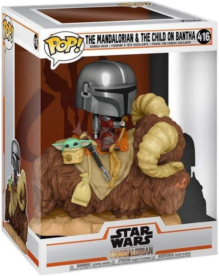 Funko POP! Figur vom Mandalorian, zusammen mit Baby Yoda auf seinem Reittier „Bantha“.