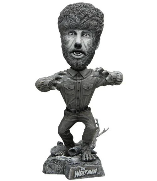 NECAs Universal Monsters Wolfman Wackelkopf-Figur in schwarz-weiß.