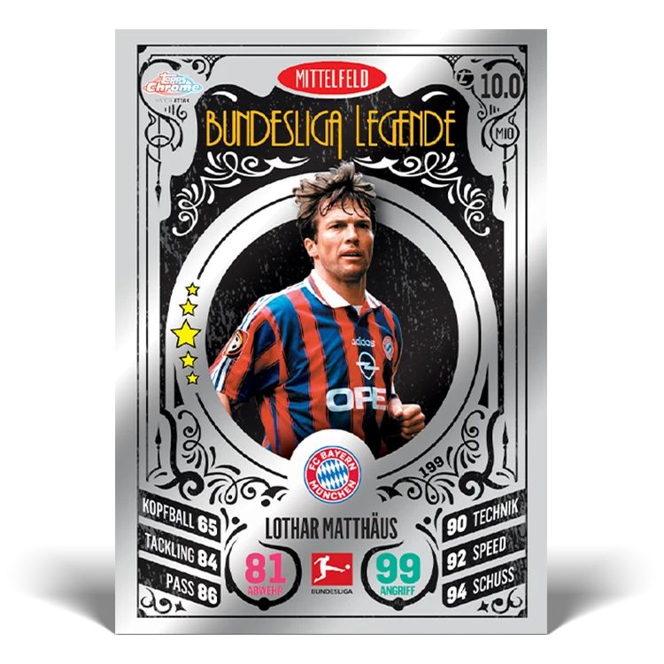 Bundesliga Match Attax Chrome ist zurück! Dieses Set besteht aus 200 reinen Chrome Karten aus der Bundesliga Match Attax Kollektion inklusive einzelner Kategorien, wie Helden von Morgen, Star Spieler oder Legenden sowie Parallels und Autogrammen!