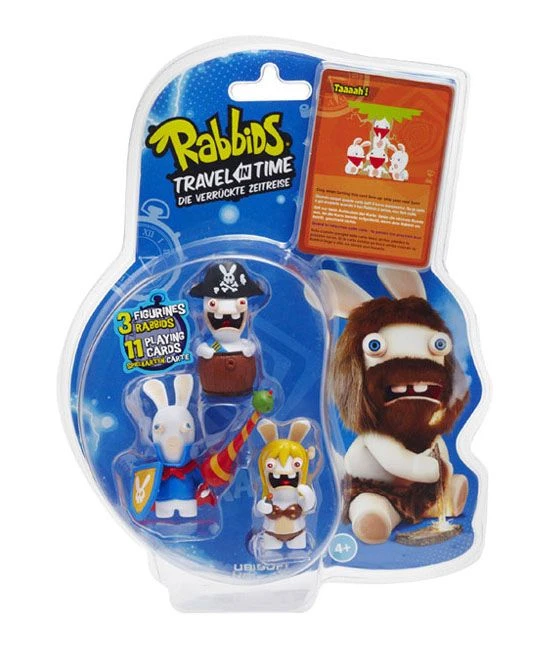 Zu neuesten Episode Zeitreise mit den durchgeknallten Hasen aus Rayman Raving Rabbids das Set B mit drei Rabbids Figuren und 11 Sammelkarten. Die Figuren sind jeweils ca. 6cm hoch. Im Set B sind mit von der Partie:Ritter mit Lanze, Pirat im Fass und Neanderhase im Bikini.